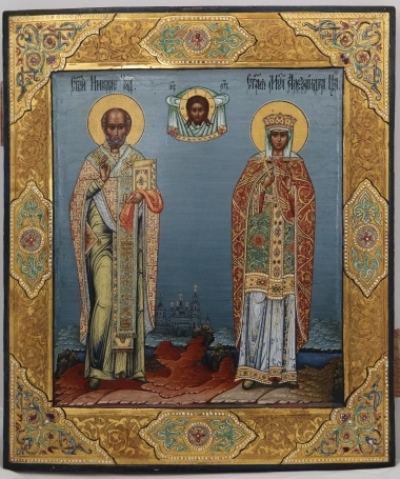 "Святитель Николай архиепископ Мирликийский и мученица царица Александра", написанной в память о коронации Николая II и его супруги Александры Феодоровны 14 мая 1896 г. икона принадлежит мстёрской художественной культуре.