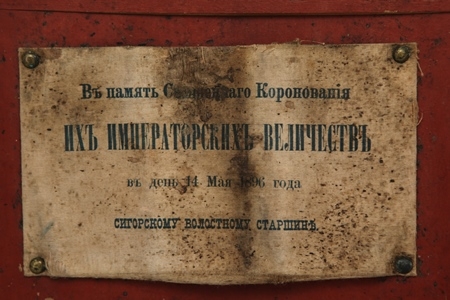 На обороте иконы помещена знаменательная надпись: «В память Священнаго Коронования ихъ императорскихъ Величествъ въ день 14 Мая 1896 года Сигорскому волостному старшине». 14 мая 1896 года навсегда вошел в историю России – в этот день совершилась последняя коронация императора и его супруги в Российской империи. Николай II Александрович и его супруга Александра Феодоровна были коронованы в Успенском соборе Московского Кремля. Помазание на царство совершил митрополит Санкт-Петербургский Палладий (Раев). Коронационные торжества длились несколько дней, это событие широко праздновали по всей России. Дорогим друзьям и церковным деятелям специально заказывали так называемые памятные коронационные иконы с изображением небесных покровителей императорской четы – святителя Николая Чудотворца и мученицы царицы Александры.