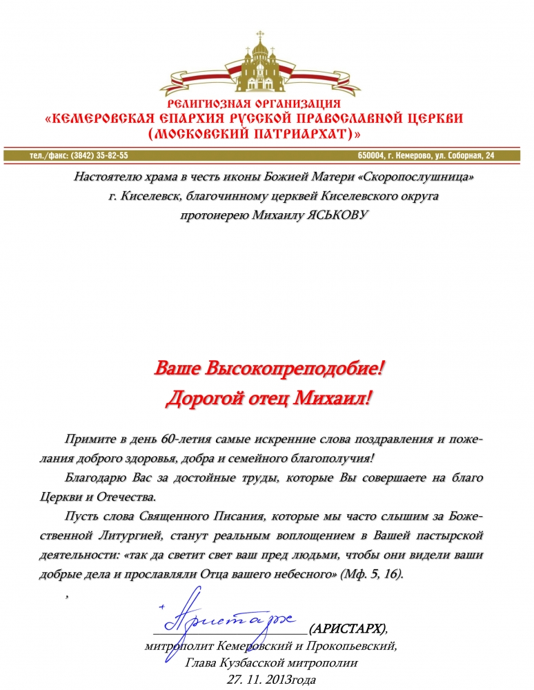 В Ваш день рождения хочу от души поблагодарить за Ваш духовный труд на благо киселевчан, за бесчисленные молитвы, за доброе и большое сердце! Искренне желаю безудержного желания любить и ценить каждое счастливое мгновение, которое преподносит Вам жизнь!