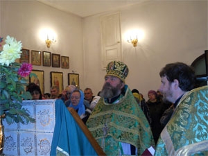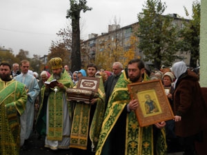 Божественную литургию в праздничный день возглавил благочинный церквей Киселевского округа протоиерей Михаил, ему сослужили священники храма иконы Божией Матери «Скоропослушница» протоиерей Константин Аршинин, иерей Андрей Корнев, диакон Алексий Никитин. Перед богослужением иерей Андрей Корнев совершил водосвятный молебен. По окончании богослужения протоиерей Михаил возглавил традиционный крестный ход вокруг храма. Во время молитвенного шествия храм, и всех присутствующих священнослужители щедро окропляли святой водой. К великой радости богомольцев, крестный ход состоялся с великой святыней – ковчегом с частицами множества православных святых. Реликвия находилась в храме по случаю престольного дня, и верующие до самого вечера имели возможность помолиться всем угодникам Божиим, посетившим церковь своими мощами. Возвращались верующие в храм с крестного хода, по традиции, проходя под вознесенной над ними святыней – ковчежцем с мощами святых..jpg)